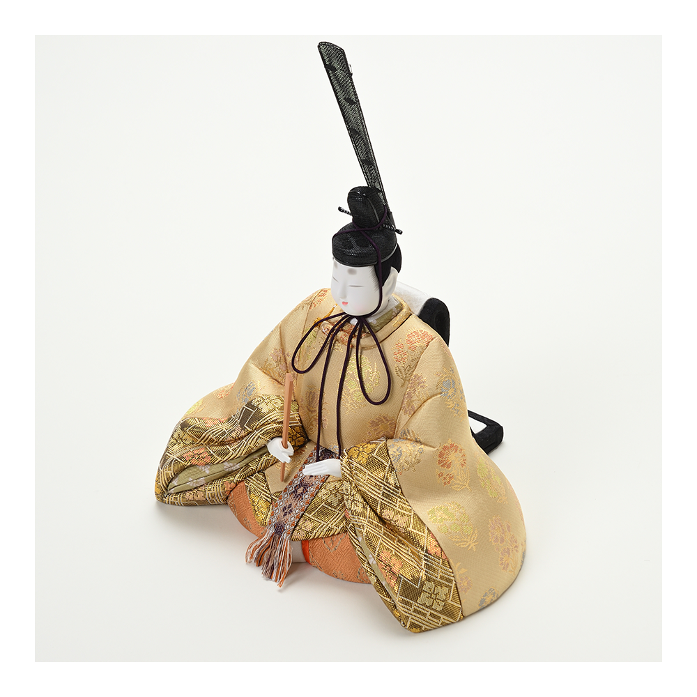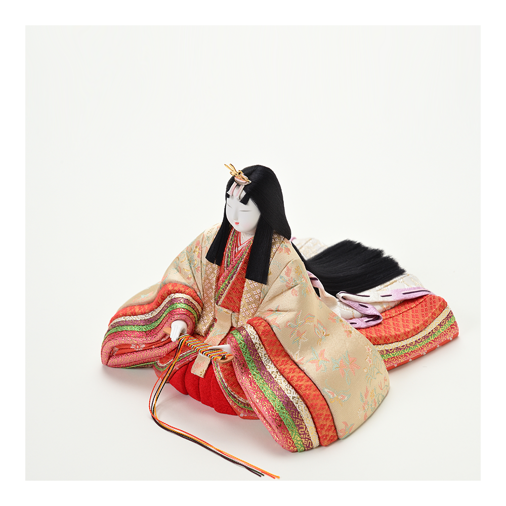 重厚感あふれる造形と、襟元や膝に施された繊細な重ねが豪華絢爛な「春慶雛」。気品と豪華さを兼ね備えた本金佐賀錦のお衣裳を使用し、手書きの本金蒔絵が施されたお道具が、さらに高級感を演出する逸品です。