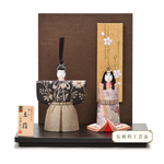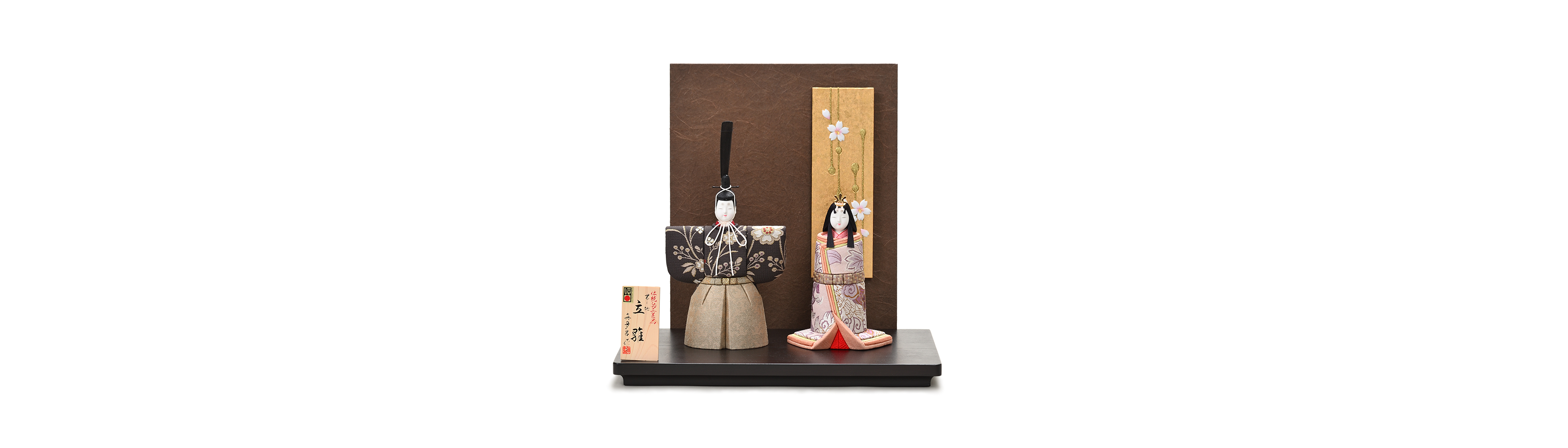 背景の衝立(ついたて)には金彩の装飾が施され、