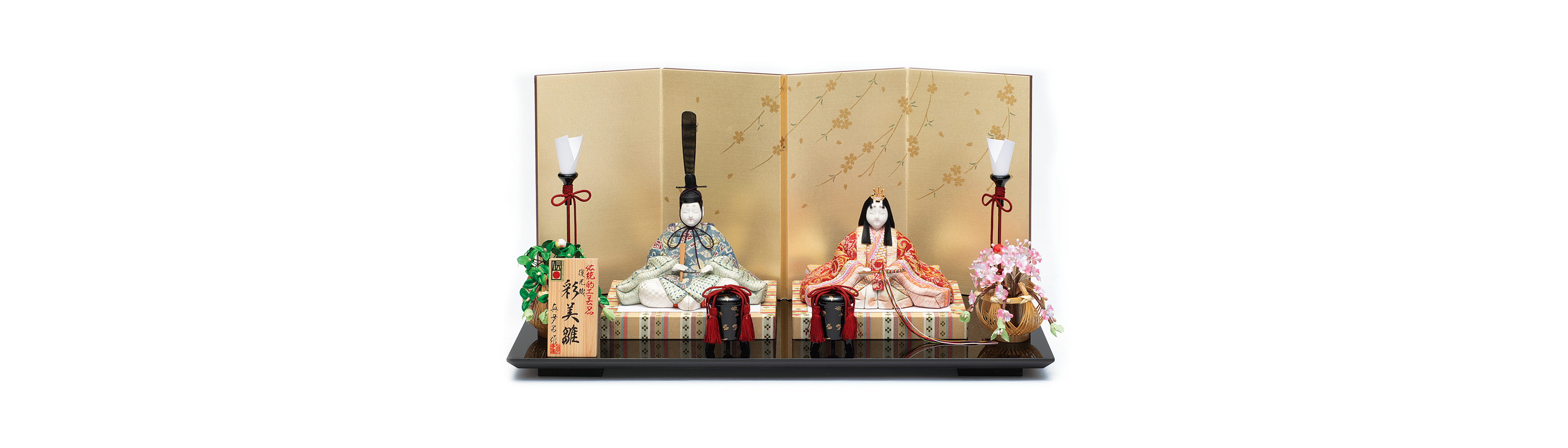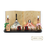落ち着いた色味と柄が特徴の復元織の衣裳をまとったお人形。紺色と赤色のお雛様の組み合わせが、雅な雰囲気を醸し出します。屏風には金彩で施された枝垂桜が描かれ、春の訪れを感じさせます。古き良き日本の美意識が息づく、上品な雛人形です。