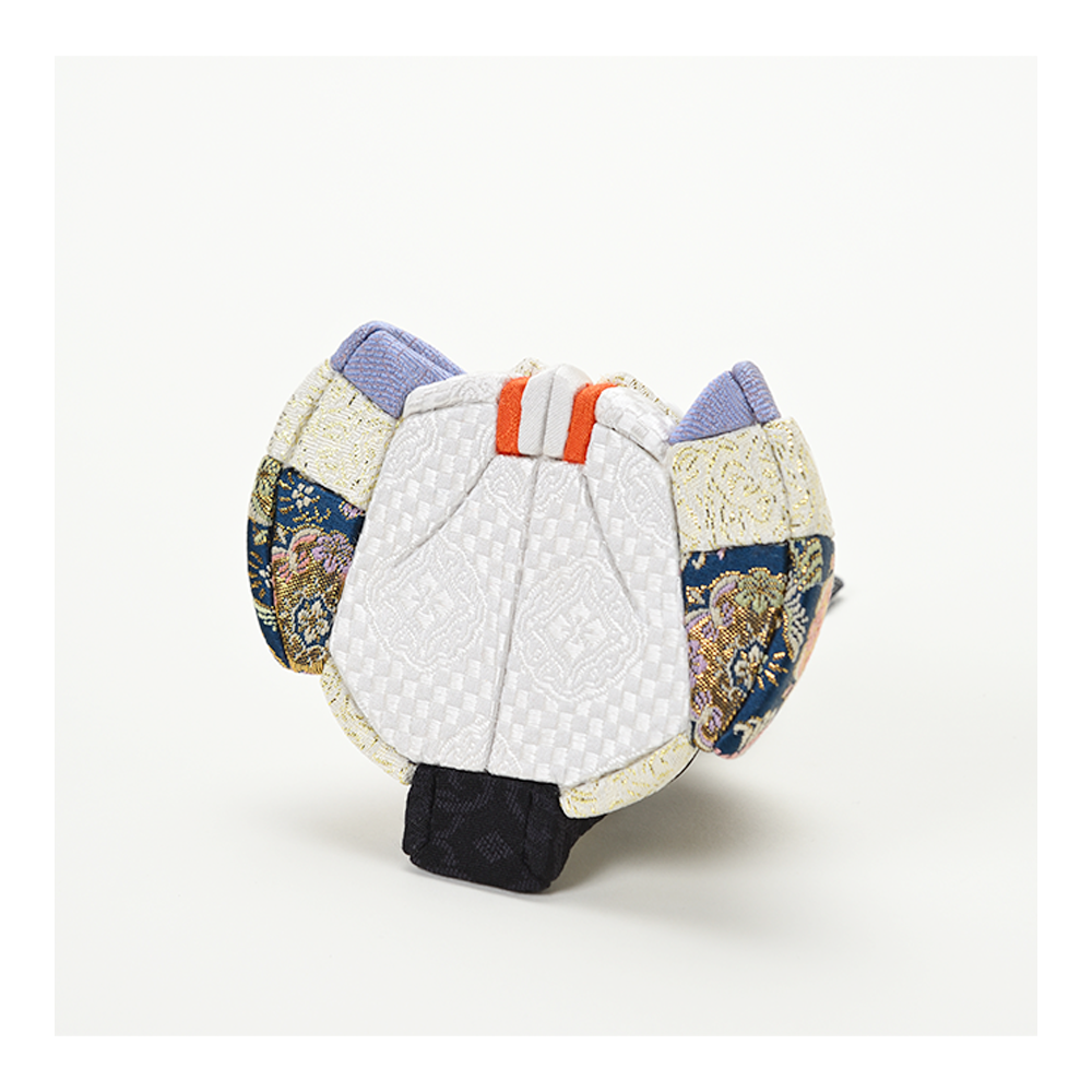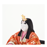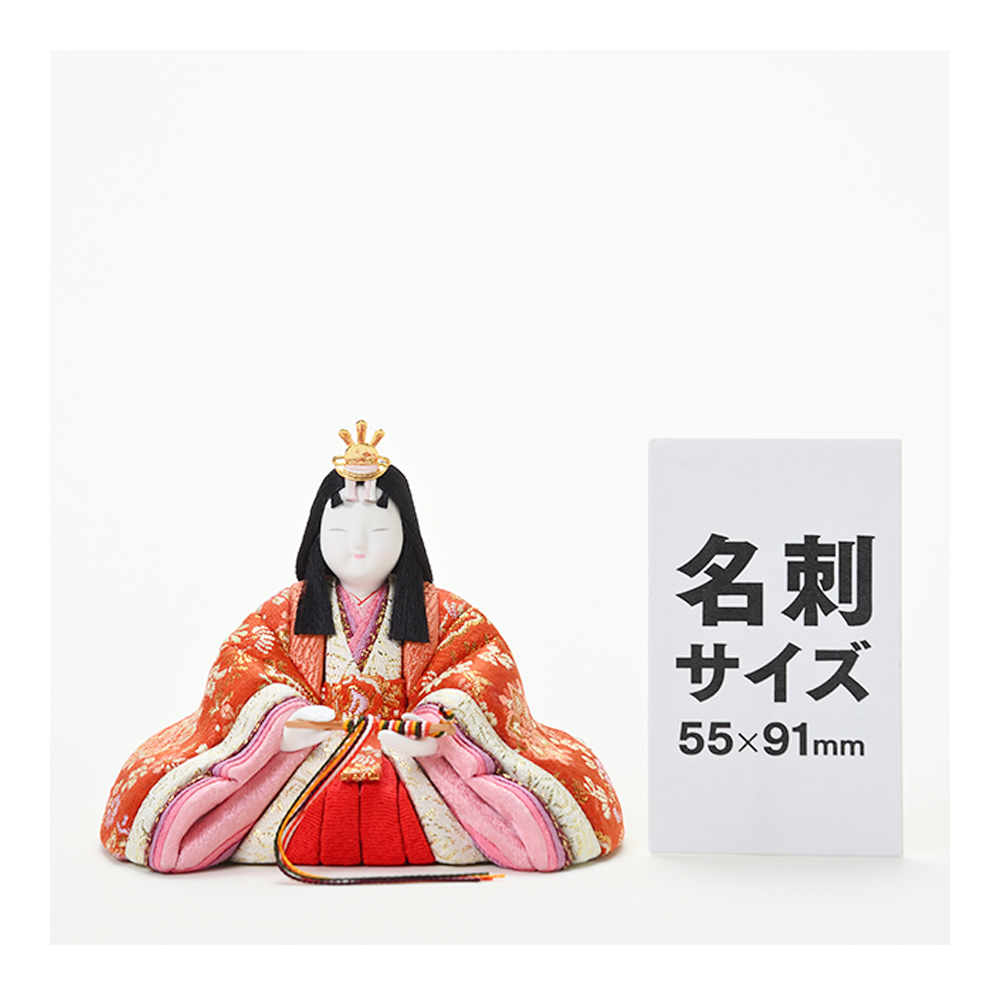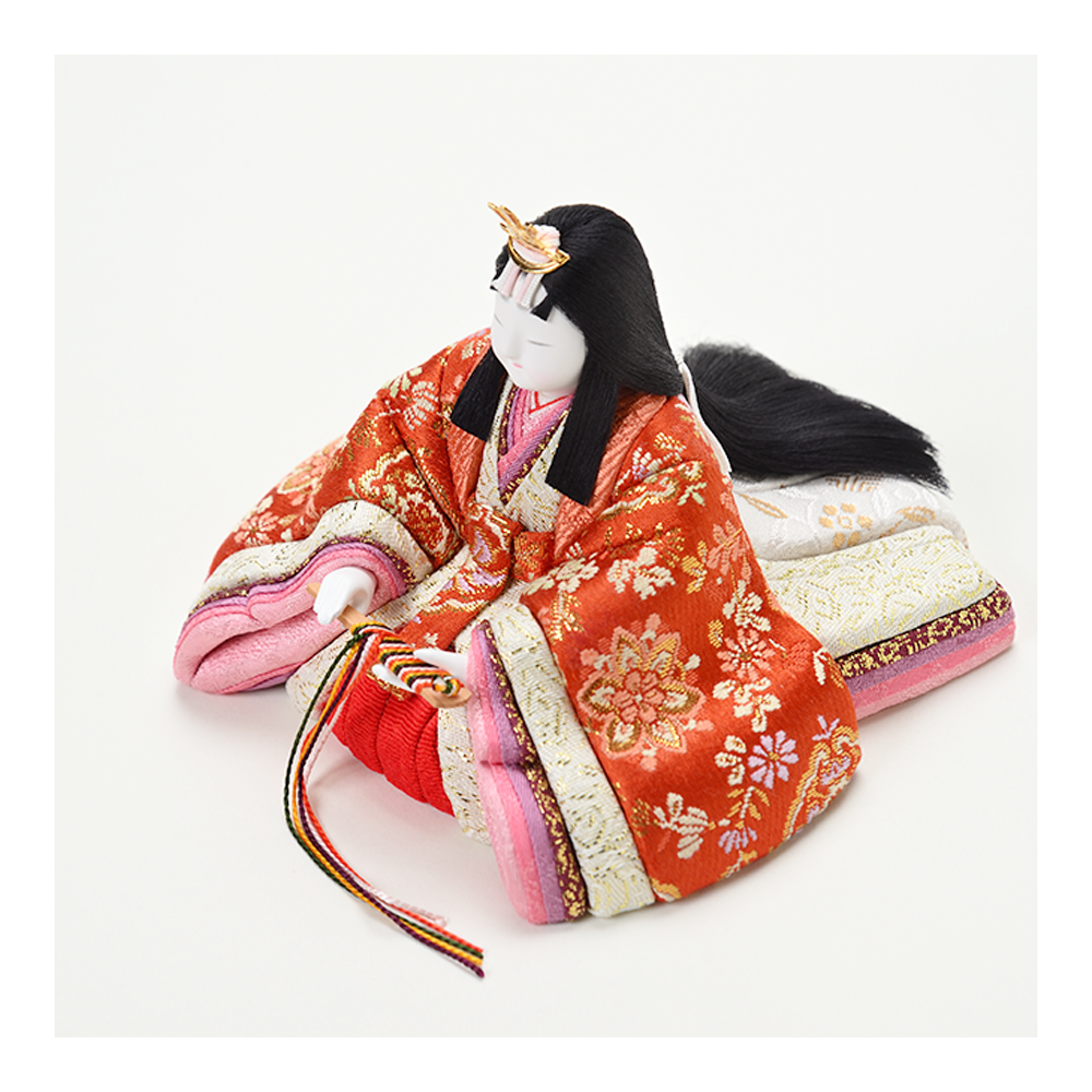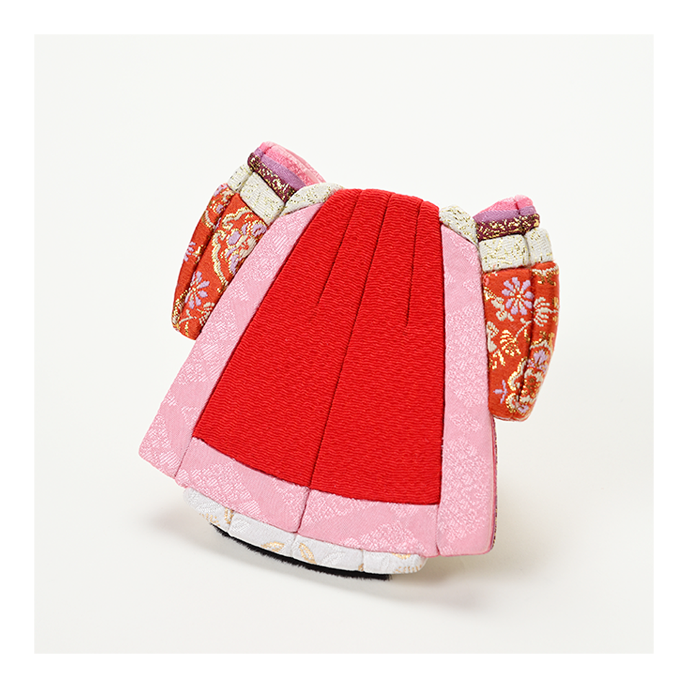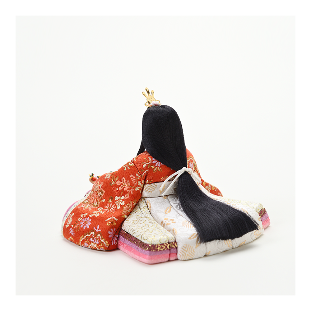 対するお姫様は、お祝いの席にふさわしい華やかな赤を基調としたお衣裳。愛らしい花柄があしらわれ、お殿様の凛々しさと美しい対比を描きます。